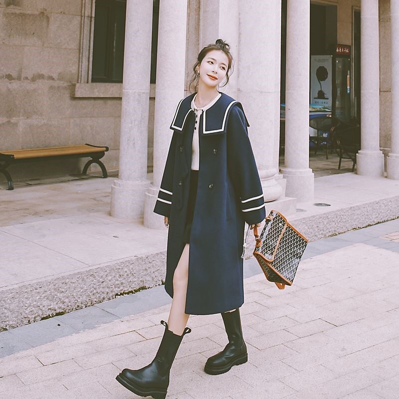 藏青色海军领设计感毛呢外套女中长款秋冬季2021新款宽松呢子大衣热门设计联盟服务商
