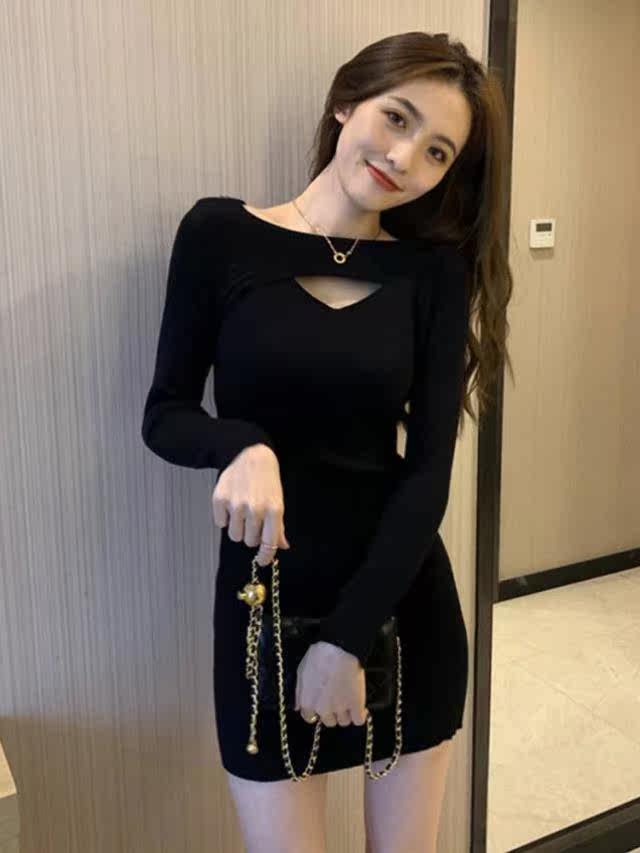 小黑裙子2021年新款秋冬复古收腰显瘦气质设计感镂空针织连衣裙热门设计联盟服务商