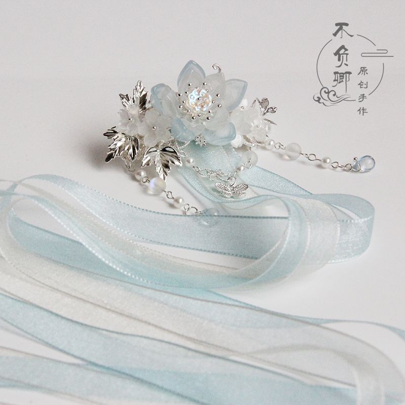 荷风抚-后压原创设计古风汉服发饰流苏簪子仙气冰蓝色飘带纱发带热门设计联盟服务商